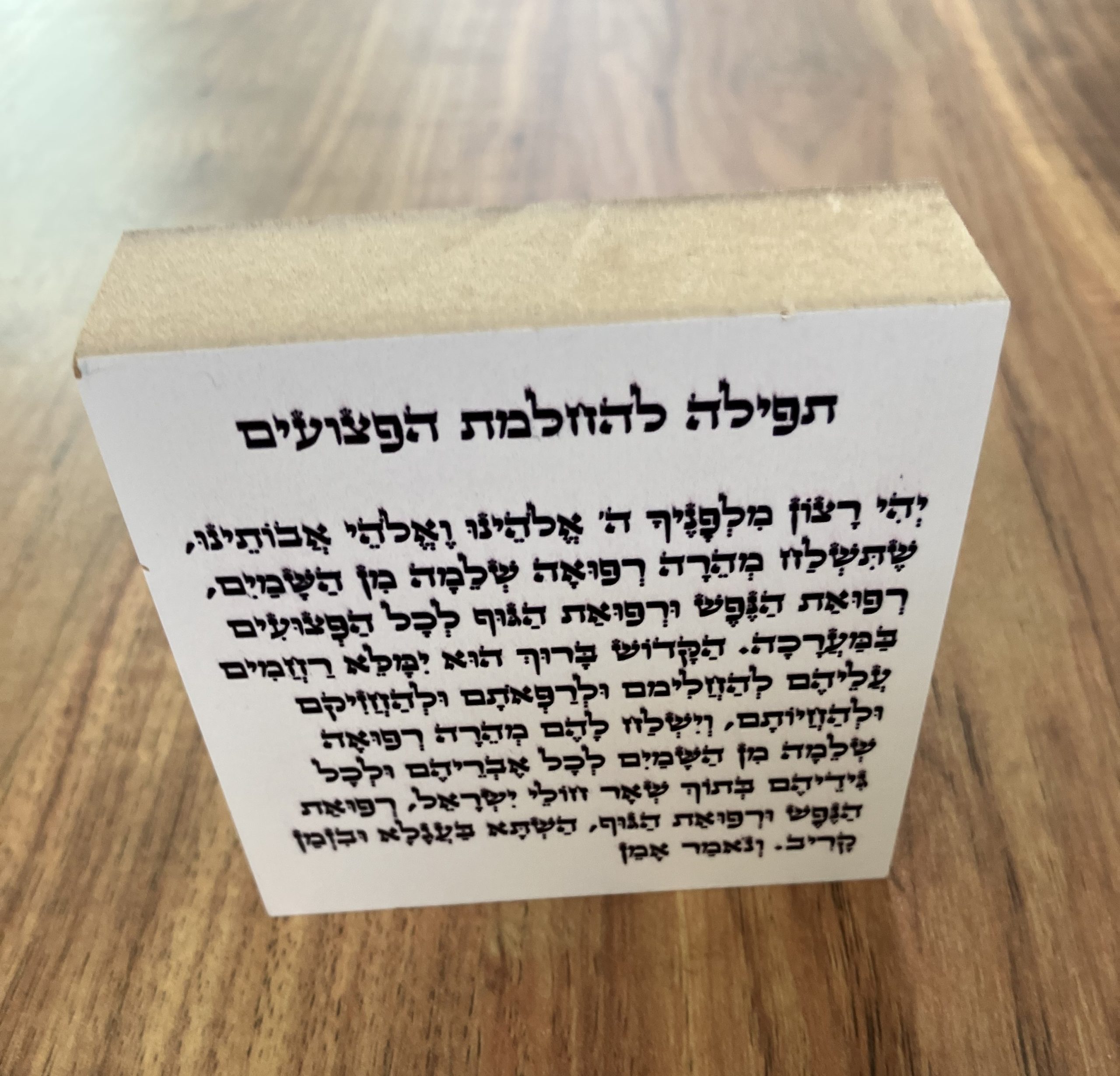 קוביית עץ עם תפילה לרפואת פצועי מלחמה היא: